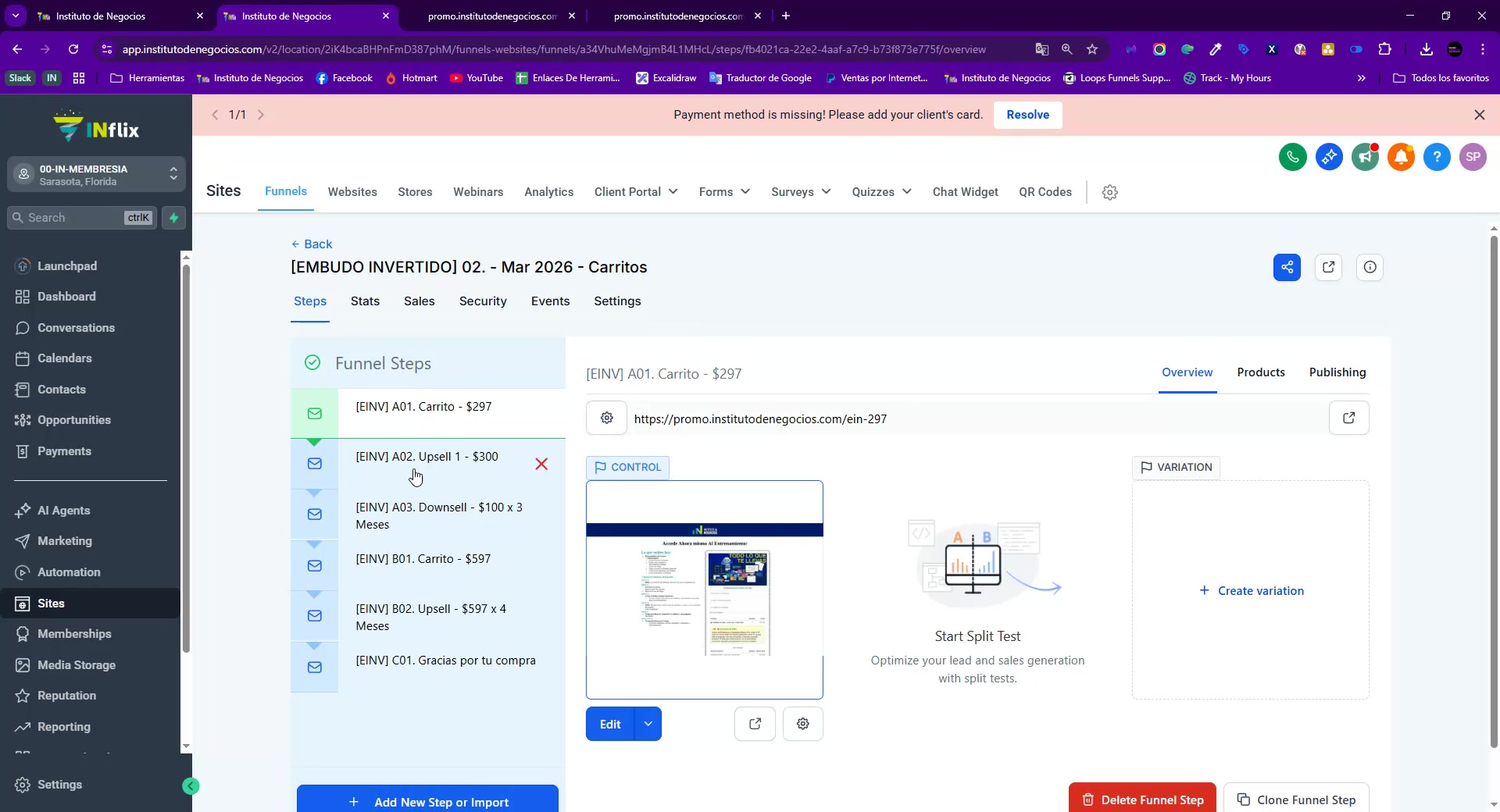 Salvador explica la configuración de carritos de compra con diferentes opciones de pago, incluyendo upsells y downsells, para una oferta específica. Describe la implementación de un cobro inicial de un dólar para activar la plataforma y evitar problemas de cobros posteriores, además de detallar el proceso de autorización y pagos automáticos. También menciona que faltan por agregar automatizaciones y videos para completar la oferta.