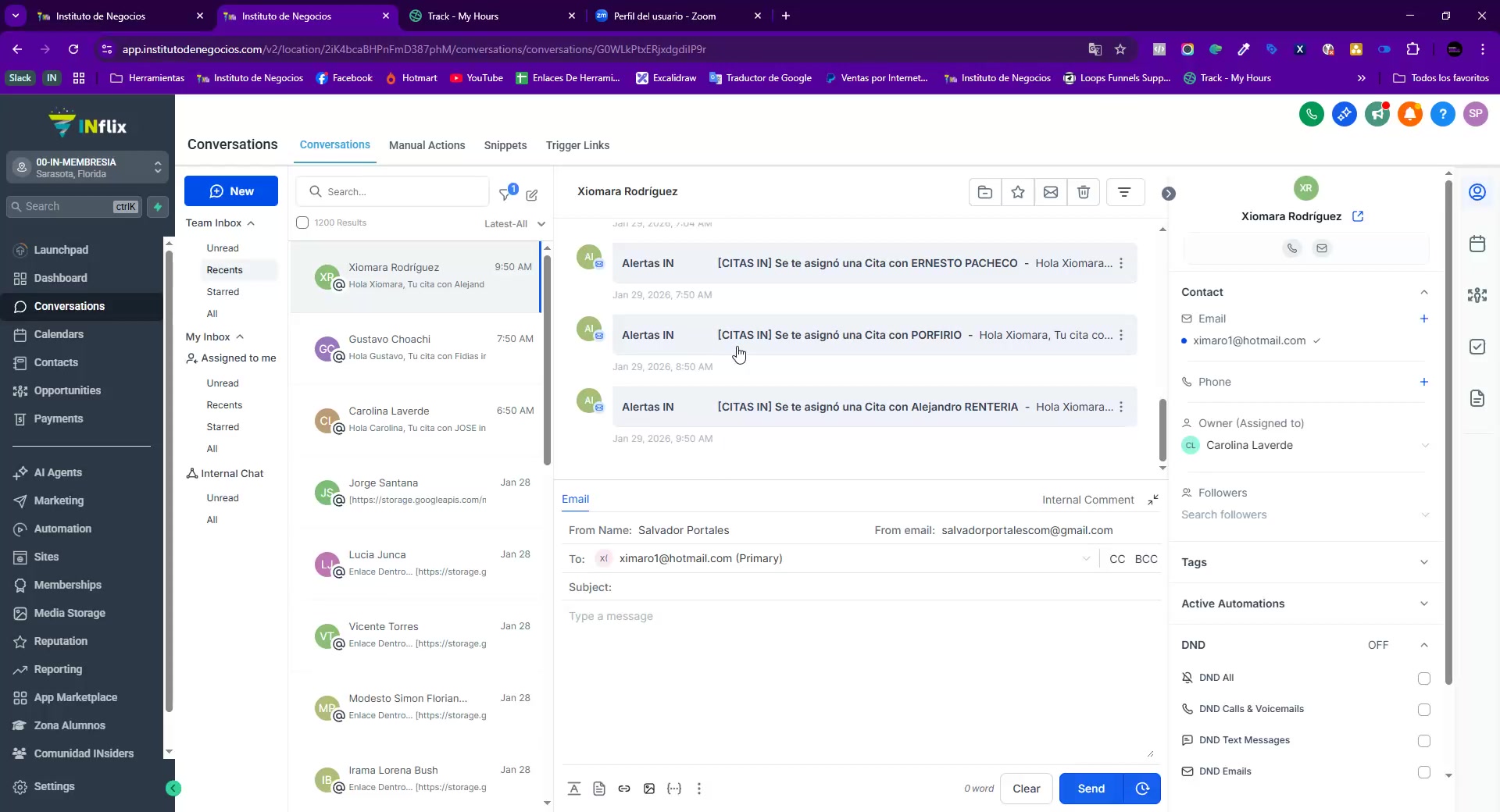 Salvador explica al equipo que ha revisado los enlaces de Zoom asignados a cada miembro y confirma que no hay problemas evidentes con ellos. Advierte que no se pueden cambiar los enlaces actualmente para evitar confusiones con las citas ya programadas y solicita que el equipo confirme si están utilizando esos enlaces.